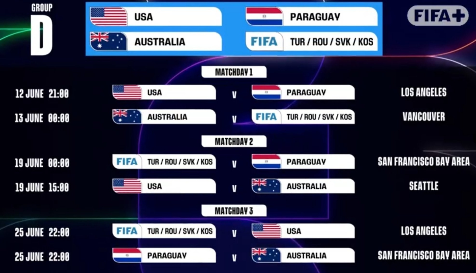 Infine, il 24 giugno a Seattle, alle 15 ora locale (le 24 in Italia), gli azzurri se la vedranno contro il Qatar, terza squadra del gruppo. Quest’ultima partita, oltre a definire la classifica finale del girone, potrebbe essere decisiva per confermare o ribaltare le sorti del cammino azzurro nel mondiale.
