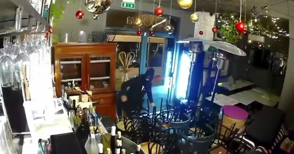 L'intera sequenza è stata ripresa dalle telecamere di sorveglianza. Nel filmato si vede l'intruso che, dopo aver mandato in frantumi il cristallo, entra e afferra una cassetta portavalori e due bottiglie di alcolici. Nel tentativo di uscire, però, inciampa proprio nel foro ricavato nella lastra: la cassetta cade e si apre. All'interno solo pochi spiccioli, meno di dieci euro, che l'uomo raccoglie rapidamente prima di darsi alla fuga.
